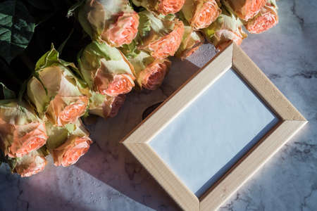 wooden picture frame with decorations. Mock up for your photo or text Place your work, print art.Holiday mock up, corel, orange roses