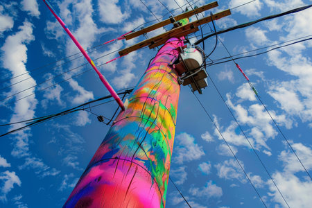 Colorful utility pole with splashes of paint set against a bright blue sky with clouds