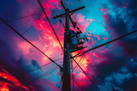 Power Line Silhouette Against Vibrant Sunset Sky. Concept Sunset Silhouettes, Power Lines, Vibrant Colors, Outdoor Photography, Nature Scene
