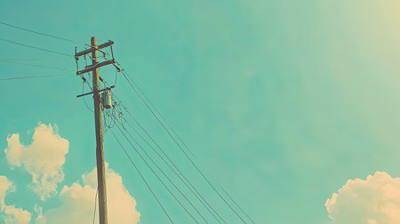 This image features a wooden utility pole reaching towards a bright blue sky, surrounded by fluffy clouds and power lines, symbolizing connectivity and serenity.