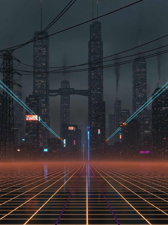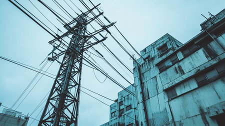 This image captures urban power lines towering against a moody sky, with weathered buildings creating an industrial atmosphere, evoking a sense of city life.