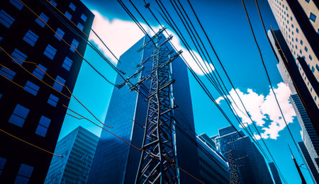 High rise building with power lines in the foreground. Generative AI.