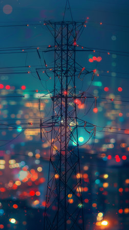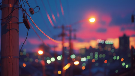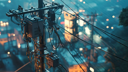 A high angle view of an electric post showcasing intricate connections and cables at dusk, illuminated by city lights, creating a dynamic urban atmosphere.