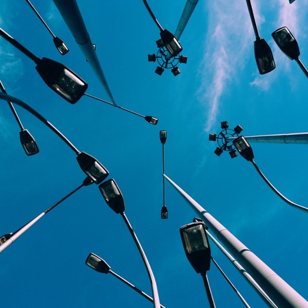 Electricity pole with overhead wires and street light lamp against blue sky