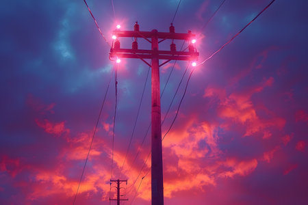 High-voltage pblems tower against the sky at sunset, power grid concept. High contrasting colors, stock photo, --chaos 30 --ar 16:9 --v 6.1 Job ID: fefbc0d2-9743-4ff9-b5c7-e09e92230f48