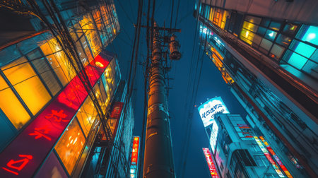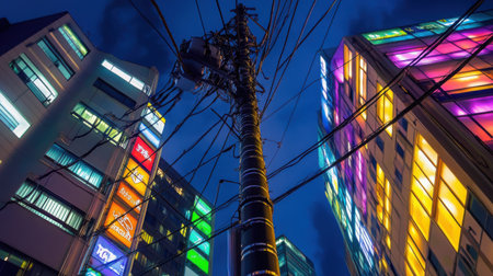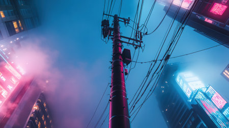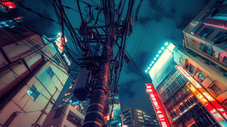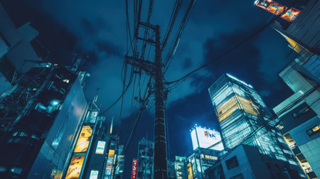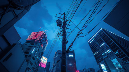 Urban nightscape in Japan with a tall telephone pole stretching toward overhead cables, surrounded by futuristic neon-lit skyscrapers.