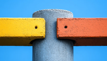 A close-up of two differently colored concrete blocks attached to a gray column.