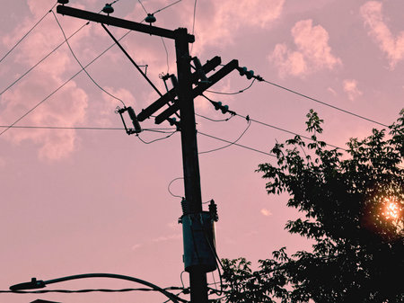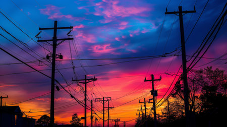 A sunset silhouette of power lines and utility poles, with vibrant hues painting the sky as the day transitions to evening.