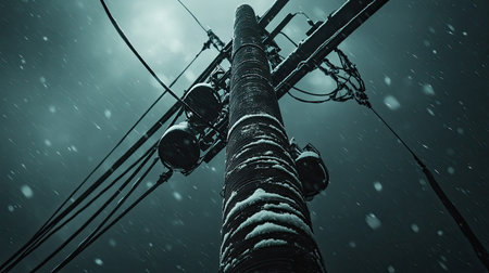 A dramatic view of a snowy power pole rising into dark clouds, capturing the essence of winter's chill. The scene evokes a sense of solitude and tranquility in the midst of a snowstorm.