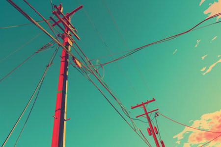 This image features an isolated power pole with electric cables against a clear blue sky, showcasing vibrant colors and minimalistic design for artistic purposes.