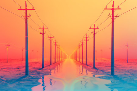 A long line of power poles with a bright orange sky in the background. The sky is a mix of orange and pink, giving the scene a warm and inviting atmosphere