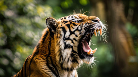A tiger is shown in a forest, with its mouth open and teeth bared. Concept of danger and wildness, as the tiger is a powerful and fierce predator