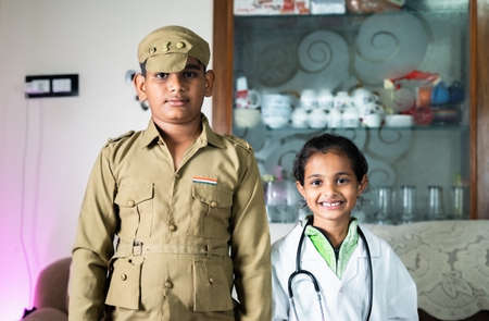 Siblings with Police and doctor costume looking camera at home - concept of kids future career planning and dream occupation.