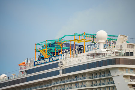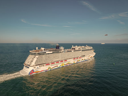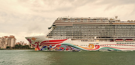 Miami, Florida, USA - November 07, 2024: Cruise in summer vacation. Norwegian Cruise line. Cruise ship tour and travel at sea. Ship of NCL. Norwegian Joy cruise ship voyage. Vessel tourism