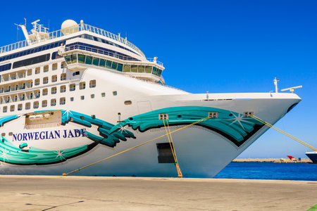August 7, 2023 Rhodes Greece. For illustrative editorial use. Cruise ship in port, background
