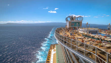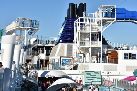 LONG BEACH, CALIFORNIA - OCT 23: Pool deck on the Norwegian Bliss cruise ship, cruising along the coast of California, as seen on Oct 23, 2018. The ship entered service on April 21, 2018.