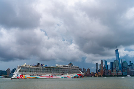New York, USA - July11, 2023: Cruise ship Norwegian Joy Sailing next to Manhattan in New York. Skyline of New York Manhattan cruising on the Hudson River cruise liner NCL
