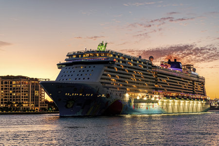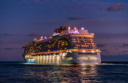 Miami, Florida, USA - December 24, 2024: Norwegian Breakaway cruise ship voyage. Cruise in summer vacation. Norwegian cruise line. Cruise ship tour. Luxury travel at sea. Ship illuminated at night