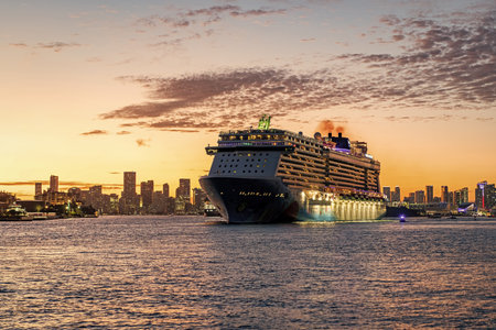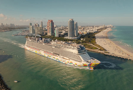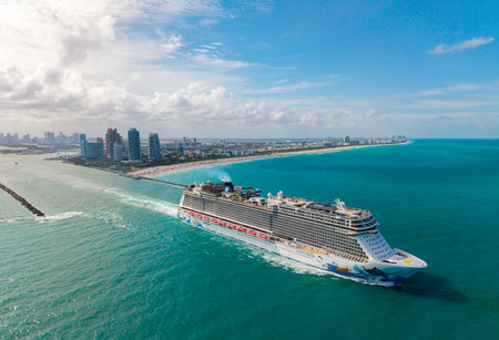 Miami, Florida, USA - January 11, 2025: Cruise in summer vacation. Norwegian cruise line. Cruise ship tour and travel at sea. Ship leaving port of Miami. Norwegian Breakaway cruise ship voyage