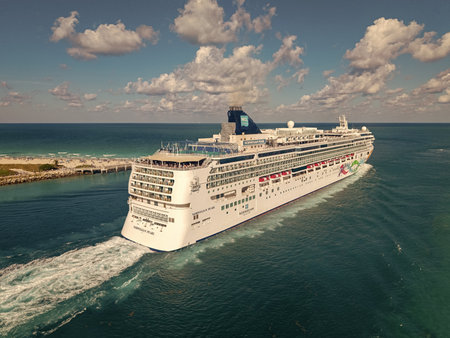 Miami, Florida, USA - March 27, 2025: Ship heading out to sea. Norwegian Pearl cruise ship voyage. Cruise in summer vacation. Norwegian cruise line. Cruise ship tour and travel at sea