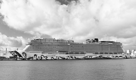Miami, Florida, USA - February 02, 2025: Ship of NCL. Norwegian Encore cruise ship voyage. Cruise in summer vacation. Norwegian Cruise line. Cruise ship tour and travel at sea. Concept of travelling