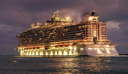 Miami, Florida, USA - December 16, 2024: MSC Seaside cruise ship voyage. Cruise in summer vacation. MSC cruises cruise line. Cruise ship tour and travel at sea. Illuminated ship at night