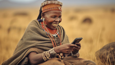 Africa Cheerful woman of african tribe hunters using modern technology smartphone cheering up. Technology using social media. Texting and having fun with cell phone,mobile in Africa traditional colorful clothing showing traditional tribe portrait