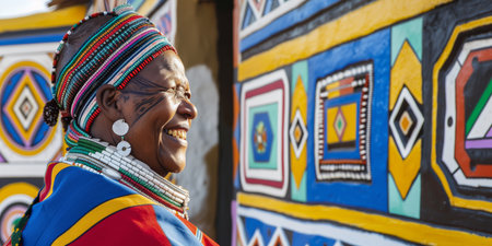 A joyful woman wearing colorful traditional attire stands beside a vibrant geometric-patterned wall, celebrating her cultural heritage