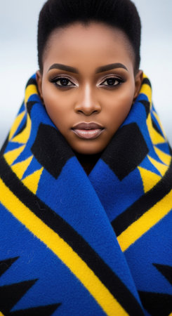 A stunning beauty portrait of an African woman with short natural hair, wrapped in a traditional Basotho wool blanket.
