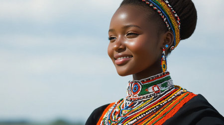 African woman in traditional attire with colorful beaded necklace and waistband. South African cultural representation and celebration. South Africa - 21 OCT 2023