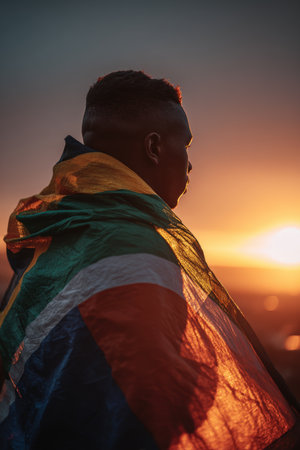A South African fan is wrapped in a flag, illuminated by a warm sunset. The glowing colors create a cinematic scene, symbolizing celebration and cultural pride.
