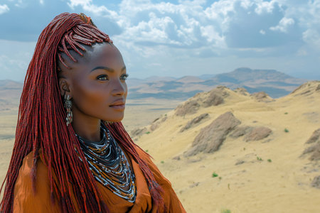 African woman in colorful dashiki, beads, sunset desert landscape