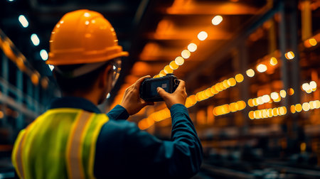 A worker in hard hat and safety vest uses smartphone in factory. background features blurred lights, creating dynamic industrial atmosphere
