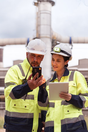 Two Professional engineer man and women working checking and maintenance pipeline construction top of the building. Worker in safety uniform using tablet at pipeline construction system