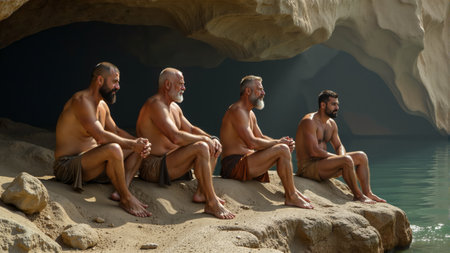 Silhouetted against the warm morning light, four men sit on the rocky edge of a serene cave, deep in contemplation. The calm waters reflect their stillness, evoking a sense of peace and harmony.