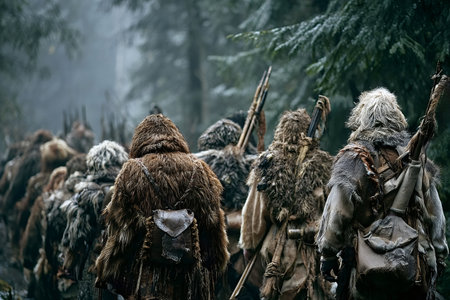 Group of primitive hunters in fur and animal skins trekking single file through a cold, dense forest with bows and arrows, evoking survival, endurance, and historical reenactment