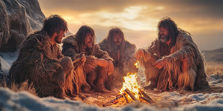 A group of ancient cavemen and women dressed in animal skins and holding spears, representing a Stone Age community in their natural habitat.