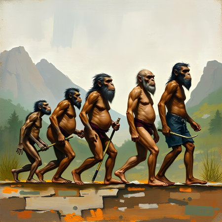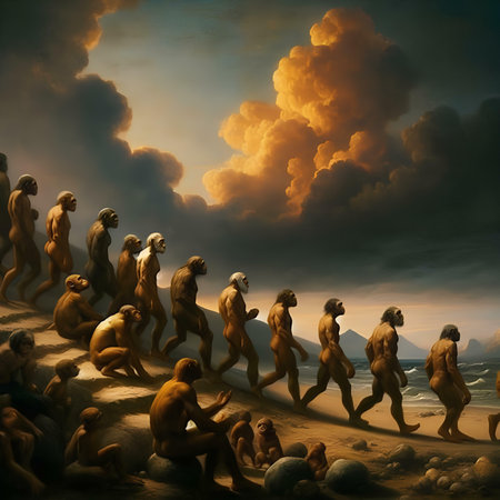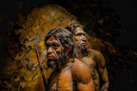 A Neanderthal and a modern man stand facing each other in a thought-provoking painting.