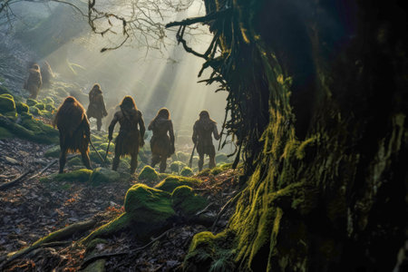 Neanderthals hunting in the ancient forest, demonstrating formidable skills and social dynamics in pursuit of sustenance