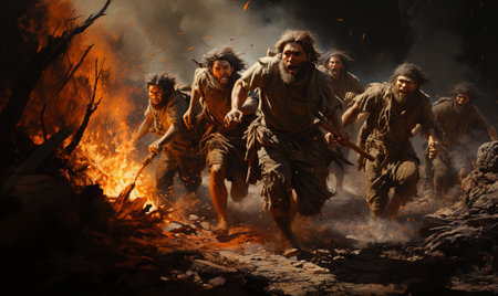 Ancient cavemen in the stone age. Stone acts. Digital painting.