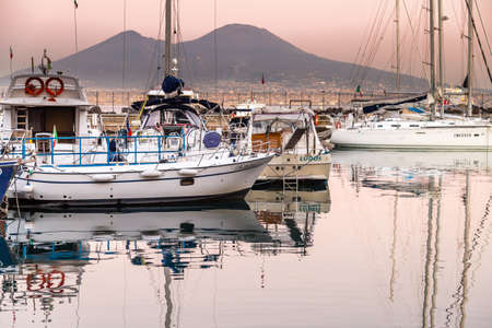 Boats and Mount Vesuvius at sunset, in Naples, Italy