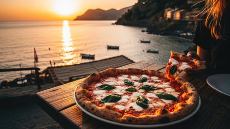 A close-up view presents a freshly baked pizza, adorned with basil and mozzarella, on a wooden table. The composition includes a hand holding a slice, with a coastal vista in the background. The scene is illuminated by warm sunlight, suggesting an outdoor dining experience. This image is suitable for culinary, travel, or lifestyle content.