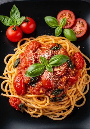A delicious plate of spaghetti with tomato sauce and basil leaves on a black background