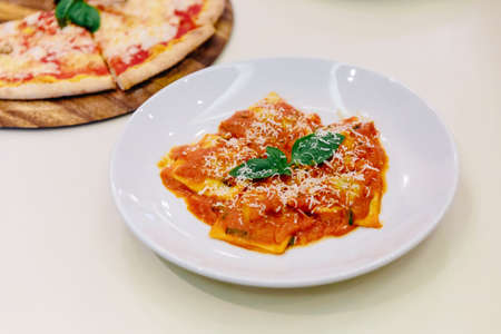 Ravioli with tomato sauce and basil topping with sliced parmesan cheese in white plate on white tablecloth.