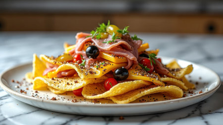 Gourmet nachos with ham, cheese, olives, and cherry tomatoes. That the image is generated using AI.