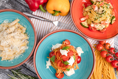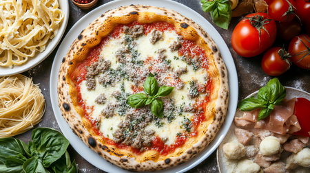 This image showcases a beautifully plated Italian dish featuring pasta, pizza, and fresh ingredients. Perfect for gourmet dining, this vibrant setup emphasizes the delightful textures and flavors of authentic Italian cuisine.