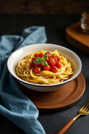 An artistic representation of a classic Italian pasta dish adorned with vibrant green basil leaves and bright red tomatoes, set on a rustic wooden table. The warm lighting enhances the inviting atmosphere, ideal for culinary blogs, restaurant menus, or food-related publications. The detailed texture of the pasta and the freshness of the ingredients are highlighted in this visually appealing composition. AI-generated illustration.