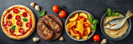 A variety of Italian dishes, including pizza, pasta, and fish, are arranged on a black surface