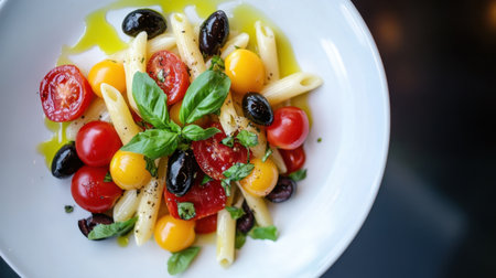 A top-down view of a colorful pasta dish with penne, cherry tomatoes, black olives, and fresh basil, drizzled with olive oil.