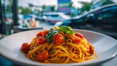 A flavorful pasta dish featuring ripe cherry tomatoes and vibrant basil leaves, presented on a crisp white plate against a rustic wooden surface, with a lively stree